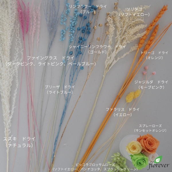 今回使用した「ファイングラス ドライ」はペールブルー、ライトピンクなど優しい色合いでアレンジに取り入れやく、手軽に雰囲気を変えることができる頼もしい素材です。