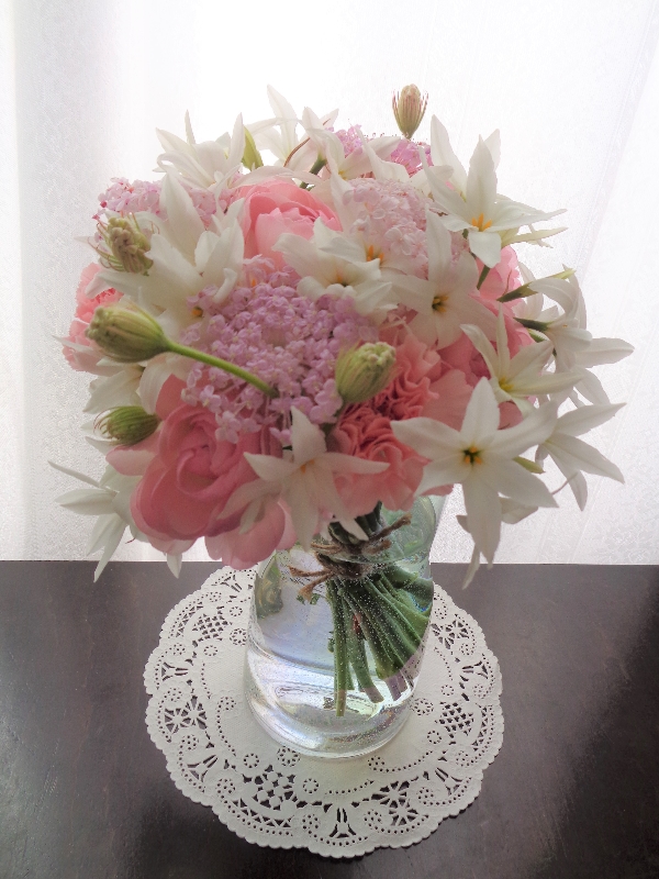 ラナンキュラス、カーネーションをメインの花に使い、リューココリーネとブルーレース(ピンク)を組み合わせてみました。