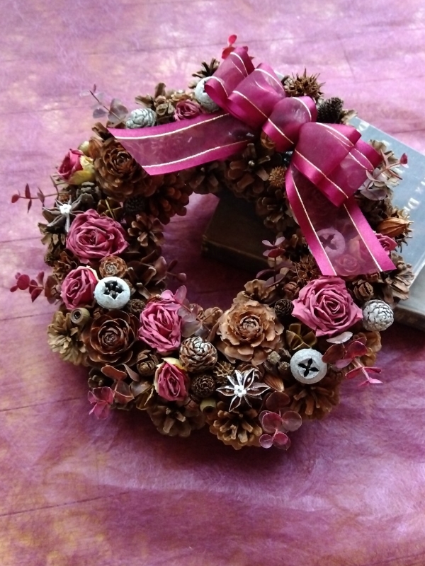ドライローズのようなアーティフィシャルのバラと木の実を合わせてリースを作りました。