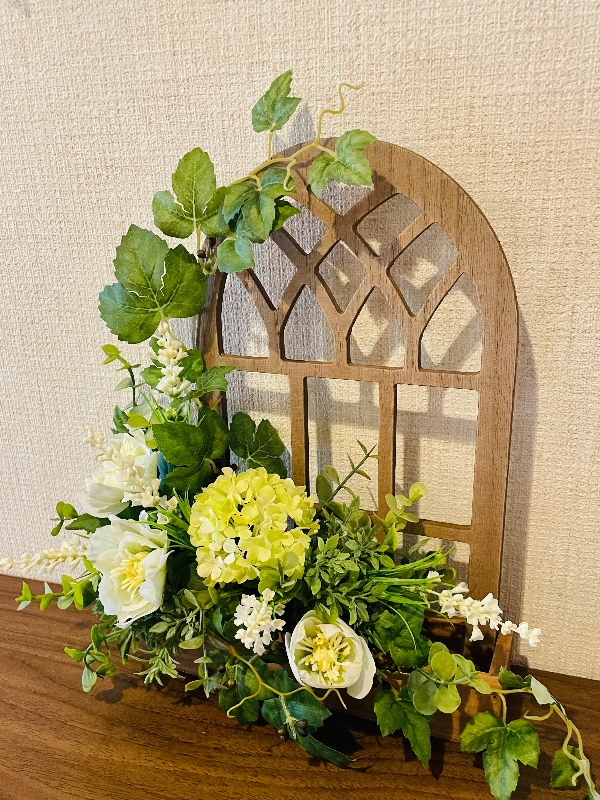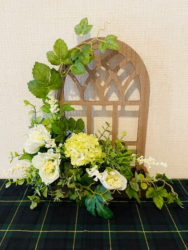 窓枠形のフレームとボックスにチュールシサスバインとたくさんの草花で初夏の彩りを。