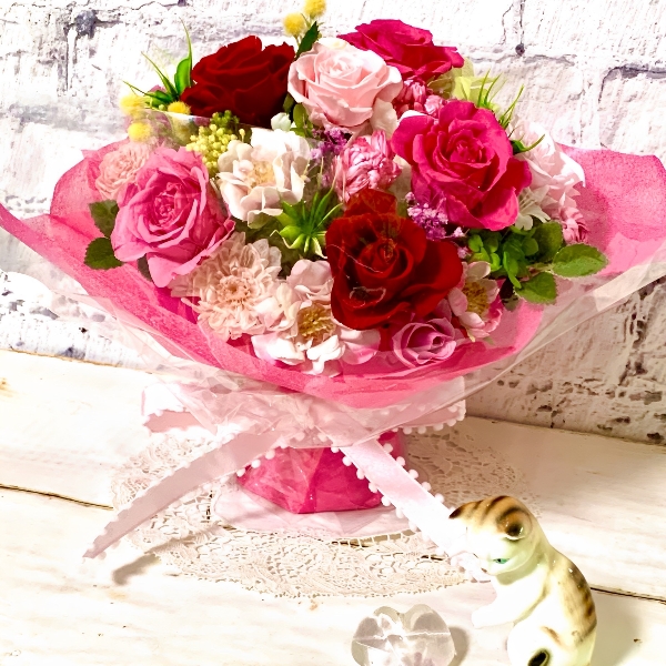 プリザーブドフラワーとアーティフィシャルフラワーのスタンディングタイプの花束を作らせて頂きました✨