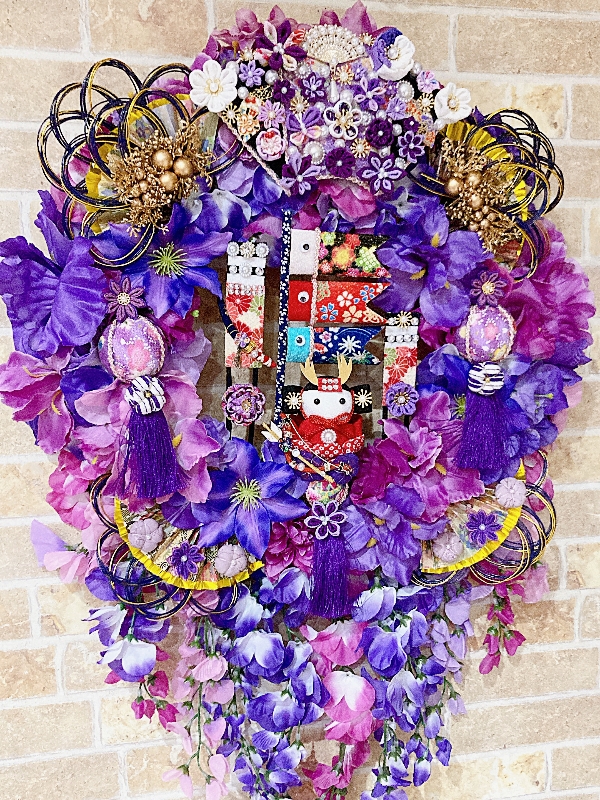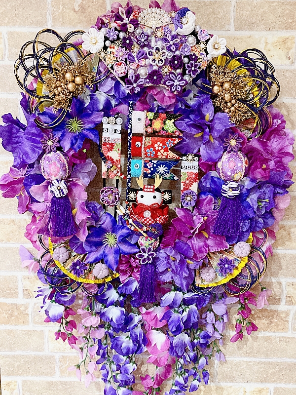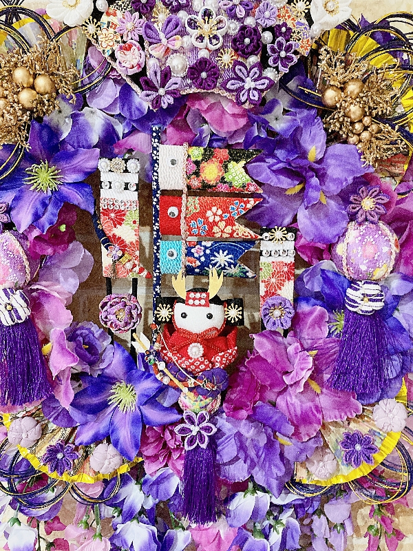 藤の花とトルコキキョウ、菖蒲の花、クレマチスをベースに扇子、水引き、ゴールドピック、タッセル、ちりめん細工の沢山のお花、鯉のぼり、大小ののぼり旗、真田幸村風兜を使って超特大サイズの端午の節句リースにアレンジ致しました。