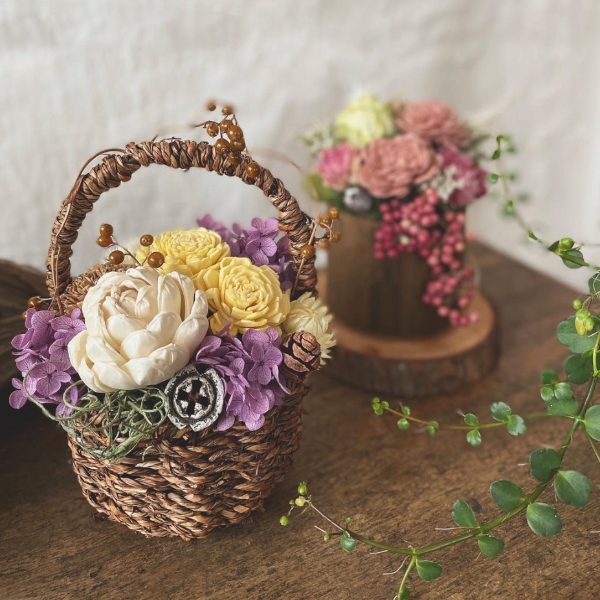 くすみカラーになりがちなドライフラワーの印象ですが、明るめを意識しました。