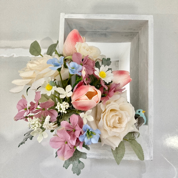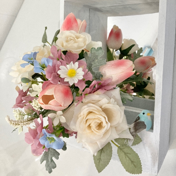 アンバーホワイトの薔薇にそっと寄り添うように咲く淡紅藤色(うすべにふじいろ)の紫陽花。春爛漫のチューリップと色とりどりの小花達。そんな華やかな花々に誘われた可愛らしい花盗人は青い小鳥です。