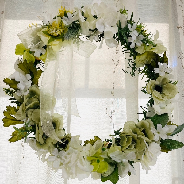 季節を問わないナチュラル感をベースに初夏に向けてアイボリーやグリーンの紫陽花etcお花達でリースにしました