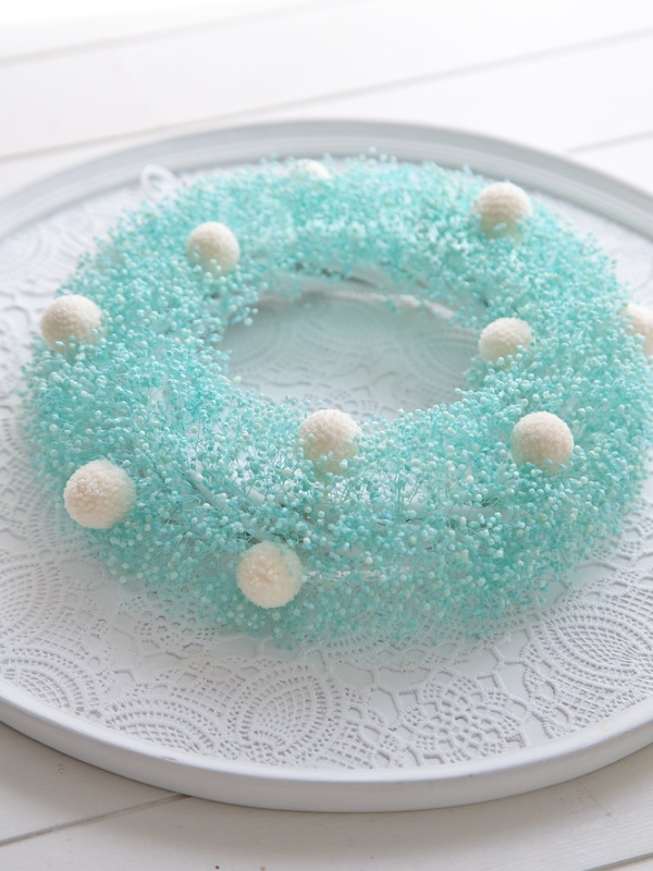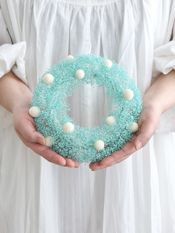 プリザーブドフラワーのかすみ草(つぼみ)とドライフラワーのビリーボタンを使用し、丁寧に制作した繊細なリースです。