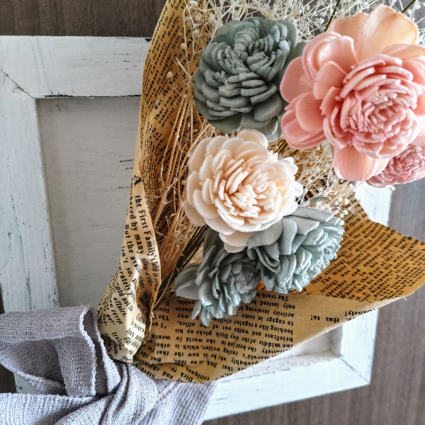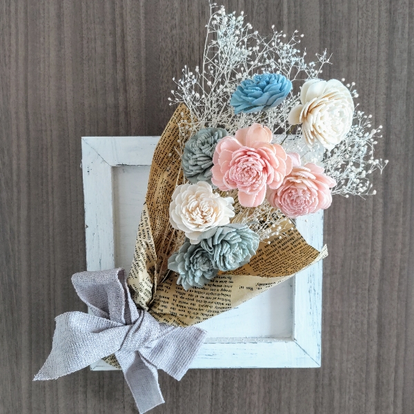 ソラフラワーとカスミソウの花束をフレームにしました。