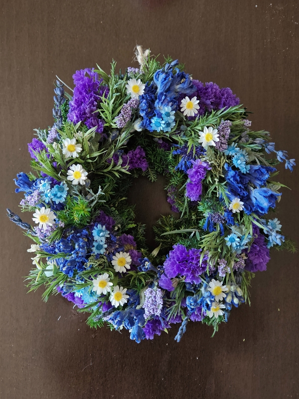 青いデルフィニウムやラベンダー、紫のスターチスが鮮やかなドライリース。