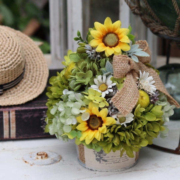 ひまわりの花と麦わら帽子を思わせる麻のリボンを