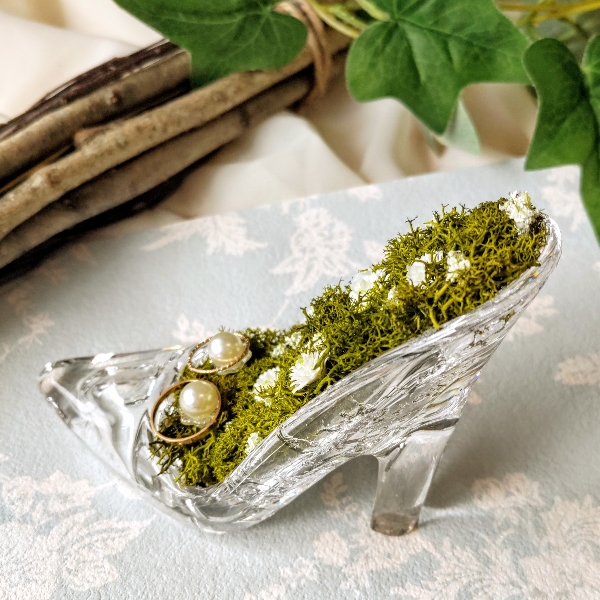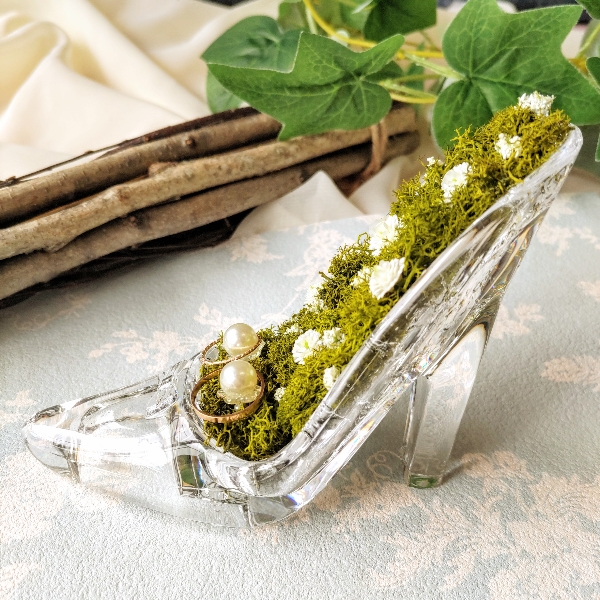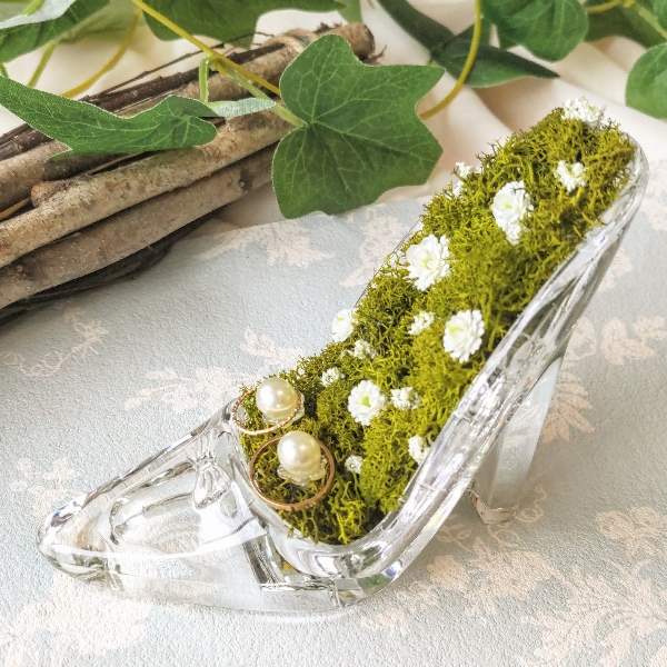 アクリルでできたハイヒールに、グリーンモスと造花のカスミソウでシンプルだけど可愛らしいリングピローを作りました。