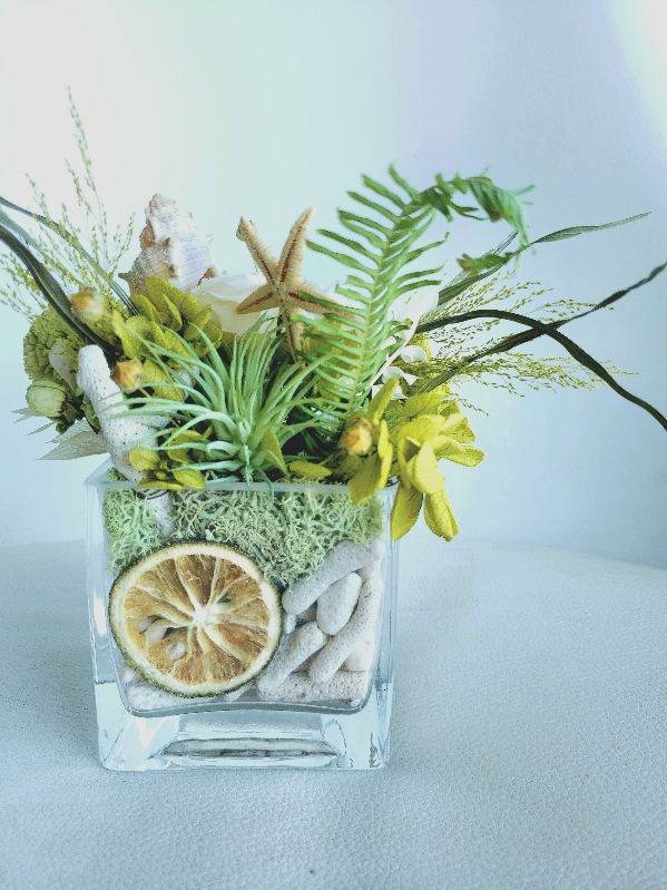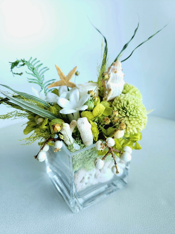 巻き貝やヒトデなども加えて海を連想させる夏らしいアレンジに仕上げております。