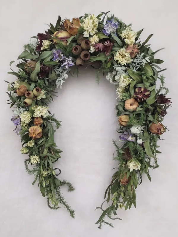 キンポウジュやヒカゲノカズラなどのグリーンのリースに、ラークスパーやシロタエギクと一緒に木の実を使用して、ホースシューリースを仕上げました。かわいい木の実でしたら、秋以外でもいいですよね。