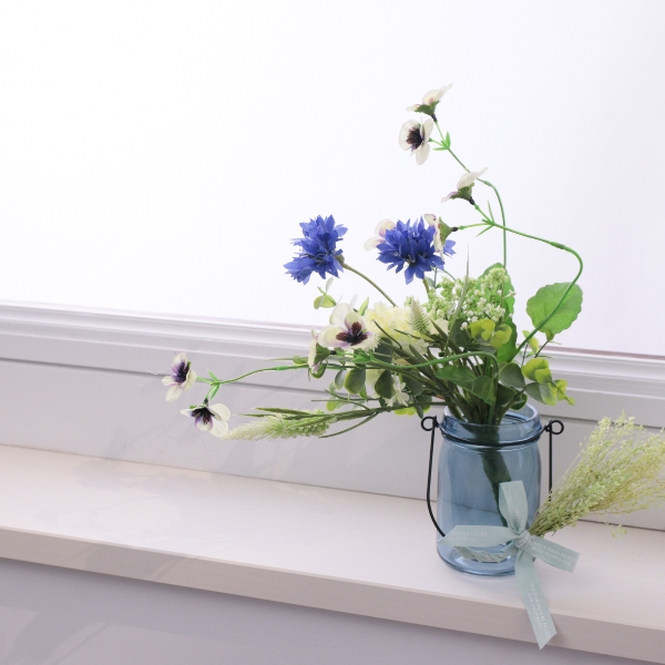さらりと飾るガラス瓶ブーケは、青いヤグルマソウスプレーが目立つ美しいデザインです。シンプルでありながらも洗練された印象を与え、青い花が鮮やかに映えるアレンジメントです。