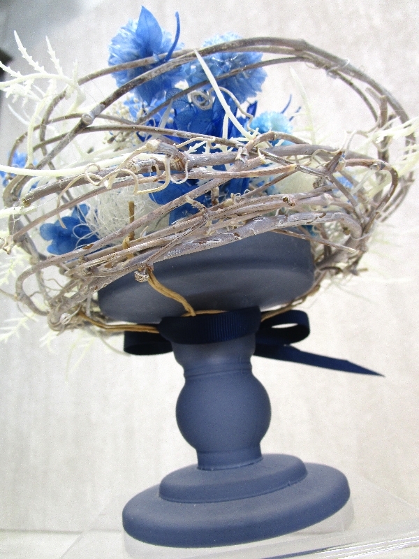 キャンドルホルダーのアレンジメントは、全体的に青い色合いを持つ美しいデザインです。ドライフラワーの千日紅などを使用し、繊細さと優雅さを演出しています。