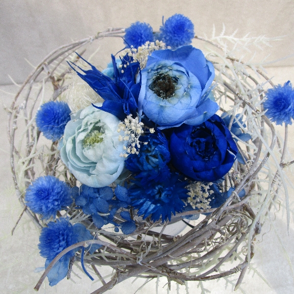 このアレンジメントでは、キャンドルホルダーを中心に配置し、青いアレンジメントを組み立てています。青い色合いは、落ち着きと涼しさをもたらし、空間に穏やかな雰囲気を醸し出します。ドライフラワーの千日紅は、その繊細な花弁と独特の形状が特徴であり、アレンジメントに優雅さと華やかさを加えます。他の青い花や緑の葉も、アレンジメントの全体像を引き立てる役割を果たします。