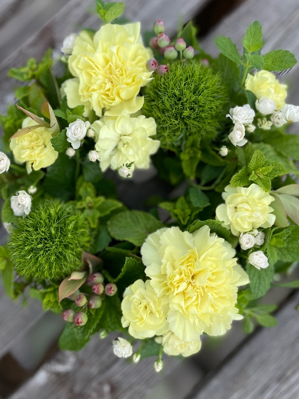 レモンイエローのカーネーションとグリーンが鮮やかなテマリソウに、庭のハーブやベリーをアレンジした爽やかな色合いの初夏のテーブルリースです。見た目にも香りにも癒されます。