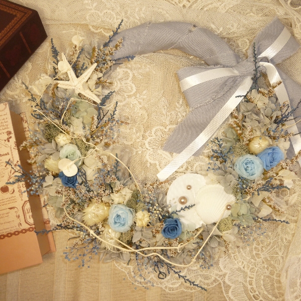 ブルーローズと貝殻のリースブーケ
