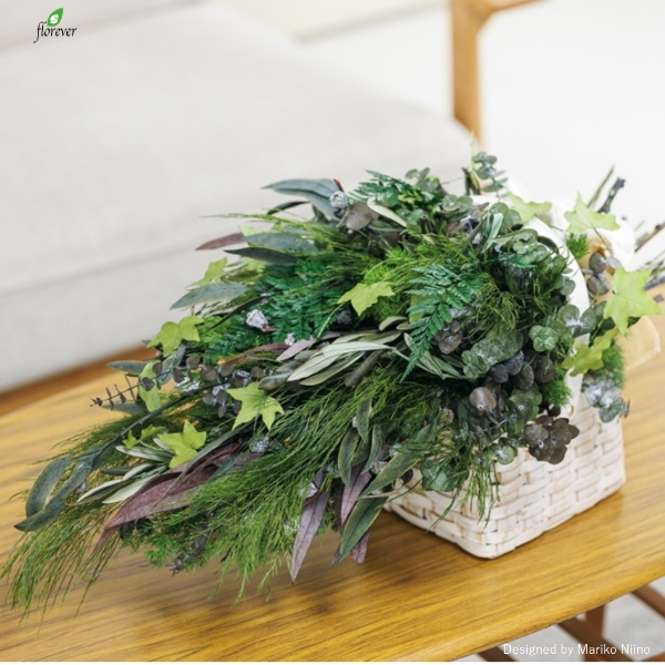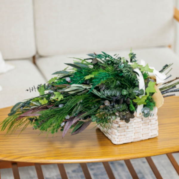 バスケットにいっぱいのグリーンを束ねたような、スプレーシェイプのアレンジメント。