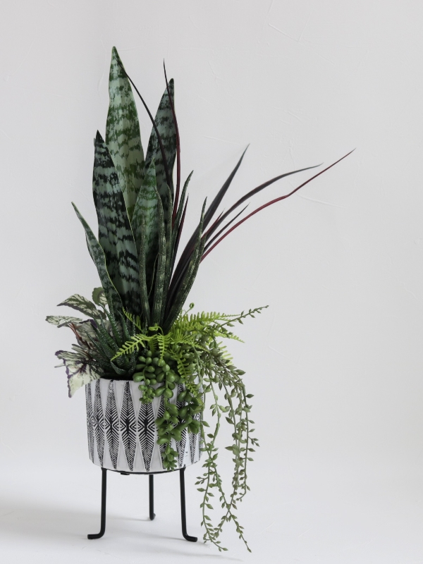 高さのある脚付きポットにさらに高く伸びやかにサンスベリアを配置し、縦ラインを強調したシャープな雰囲気にデザインしました。