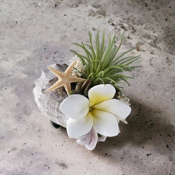 巻き貝をベースにアーティフィシャルのプルメリアやチランジア、ヒトデなどをあしらった小さなアレンジメント。