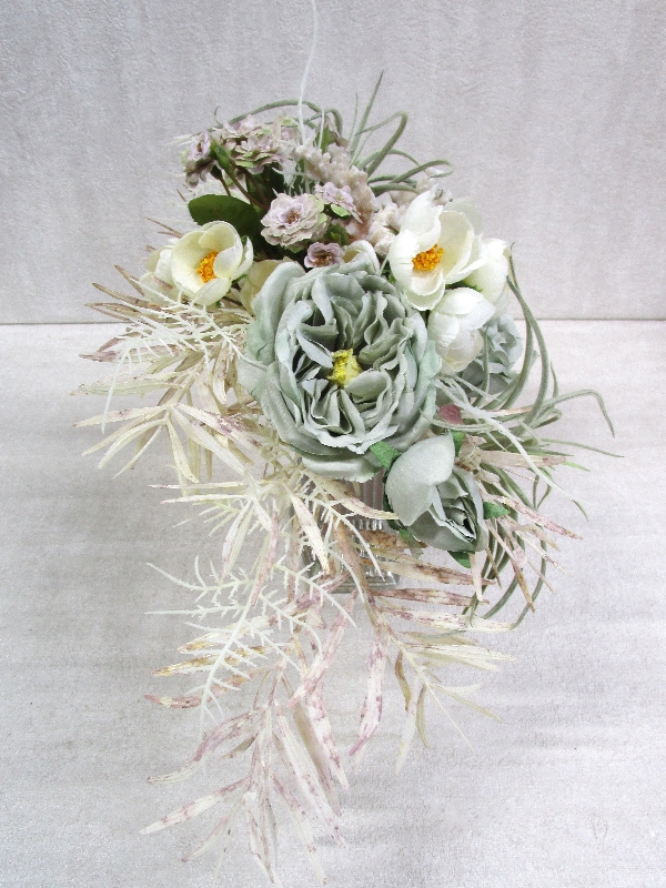 このテーブルアレンジメントは、清潔感と上品さを演出するために、全体的に白い色合いでデザインされています。フロスト効果が加えられた花やグリーンが、ほのかな霧のような美しい雰囲気を醸し出しています。