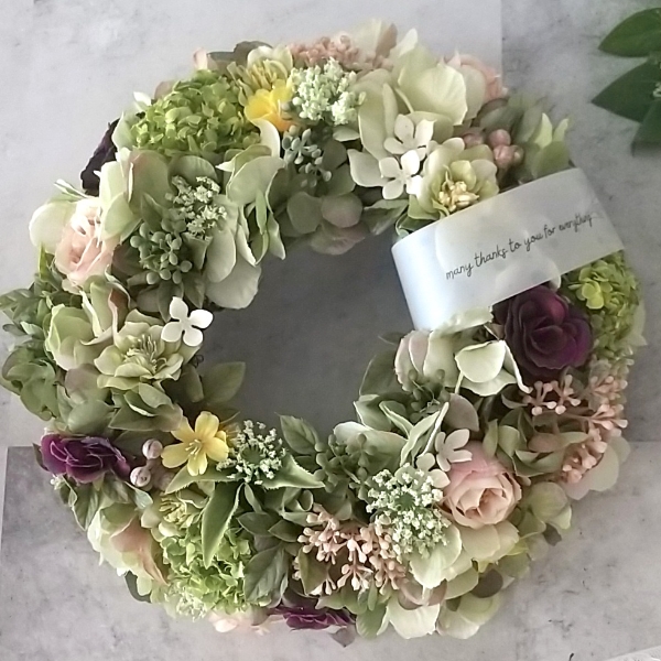 少し濃いグリーンを使って落ち着いた雰囲気のグリーンリースです。