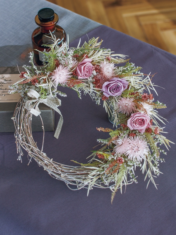 ニュアンスカラーのローズがメインのリースアレンジ。