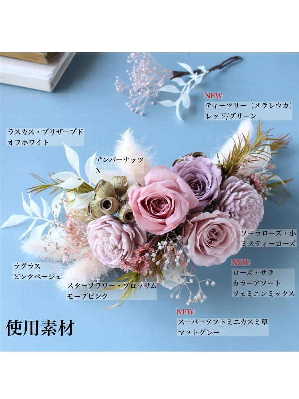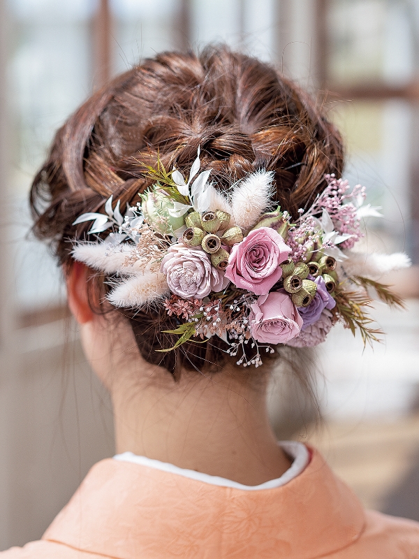プリザーブドフラワーとドライフラワーの髪飾り。ニュアンスカラーのローズや小花を使って華やかで優しい印象に。