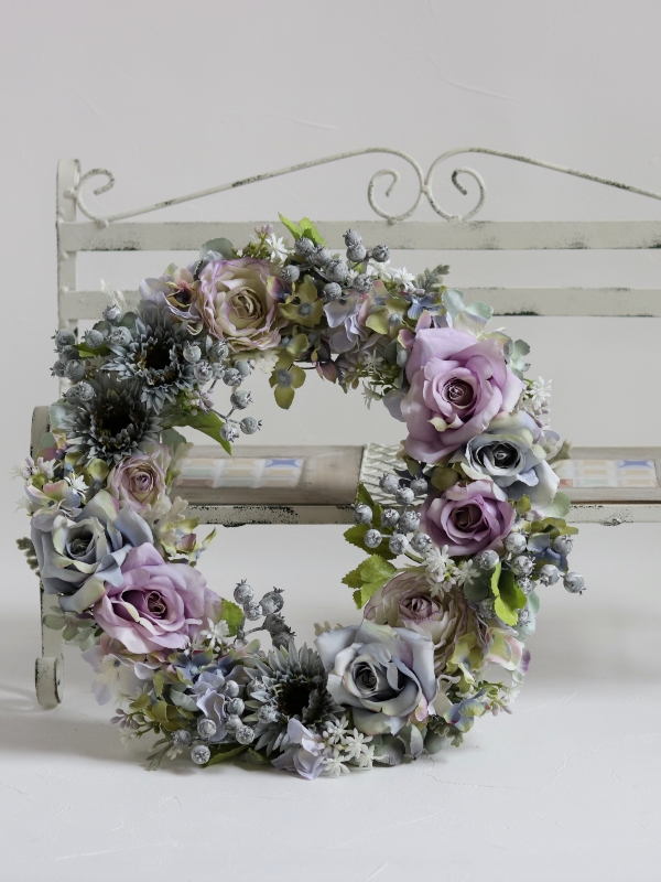 全体をペールトーンでまとめたフレンチシャビーテイストのリースです。