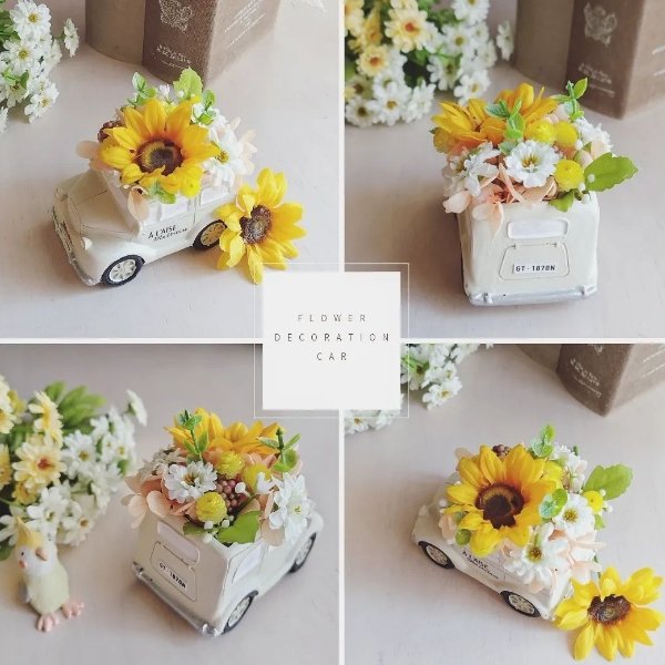 クラシカルなミニカーの器に、夏のビタミンカラーのお花をあしらいました。