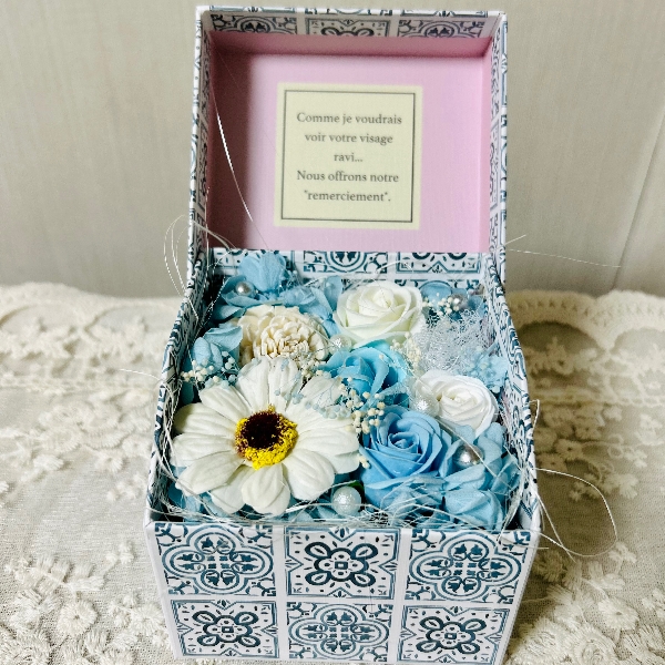 モロッカンBOXに、ブルーとホワイトのソープフラワーとプリザーブドフラワーで爽やかで可愛いアレンジメントを。