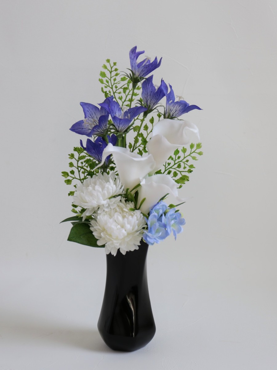桔梗・カラーリリー・アスターの上品な白と紫の組み合わせに水色のジャスミンを少しだけあしらって柔らかく優しい雰囲気に仕上げています。