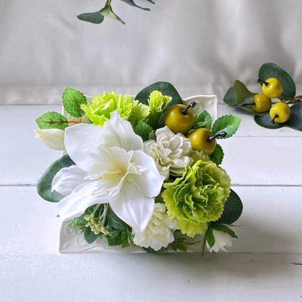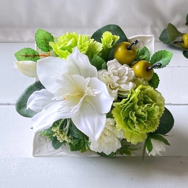 白のバラ、グリーンのカーネーション、リンゴをアクセントに爽やかでナチュラルなアレンジに仕上げた作品になります。
