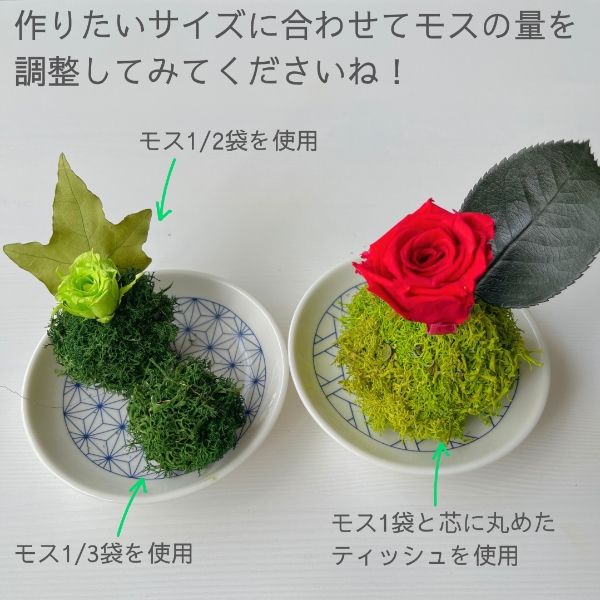 ※1袋で直径約5cmのコケ玉が1個、1/2袋で直径約3cmのコケ玉が2個作れます。