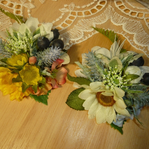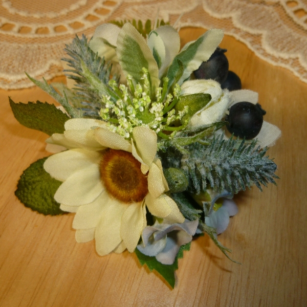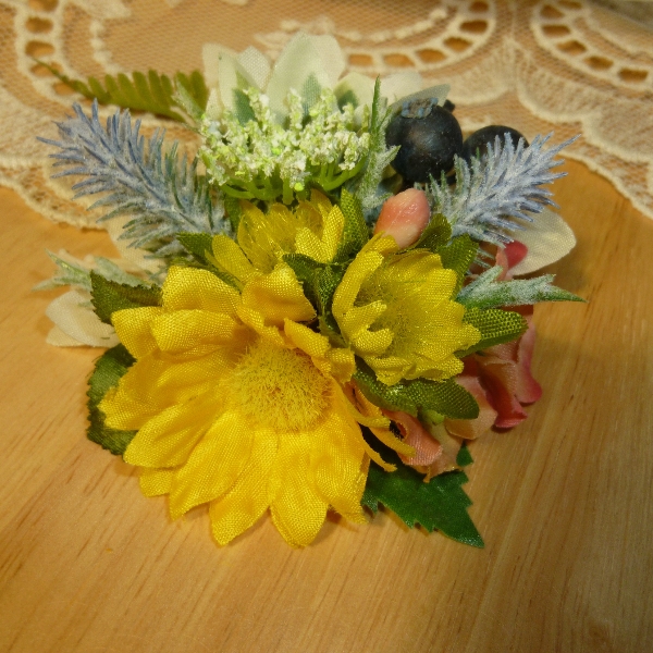 ひまわりやエリンジューム、白い小花を使ったコサージュ(髪飾り)。