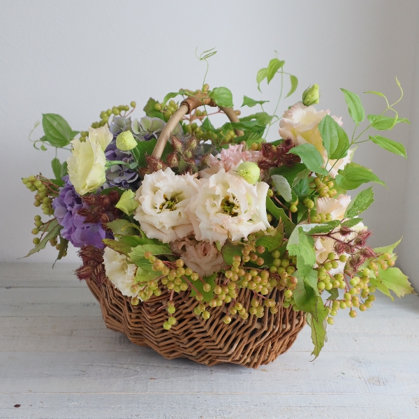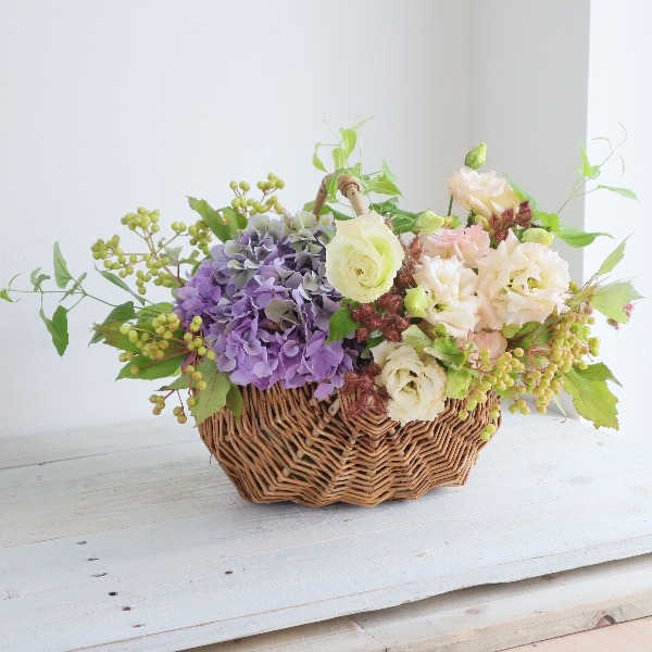 アジサイと夏トルコのバスケットアレンジ