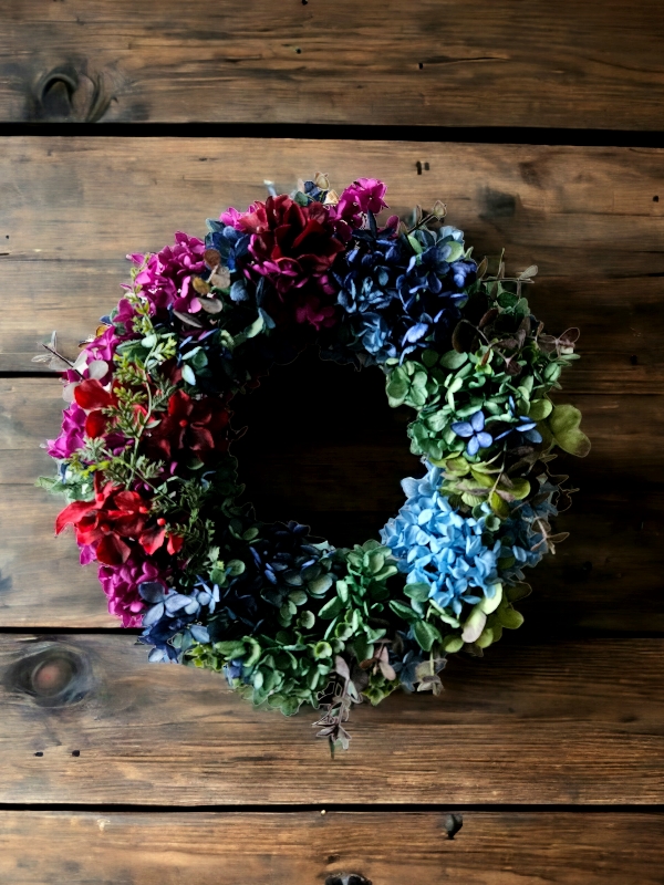 緑、青、紫、渋い赤…秋色アジサイをイメージした色合いのドアリース。
