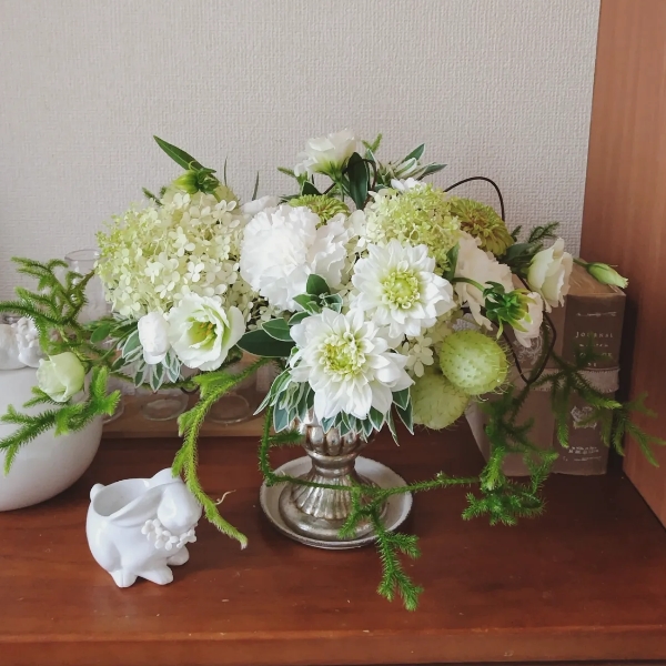 アルミワイヤーを花留めにコンポートにアレンジしました。