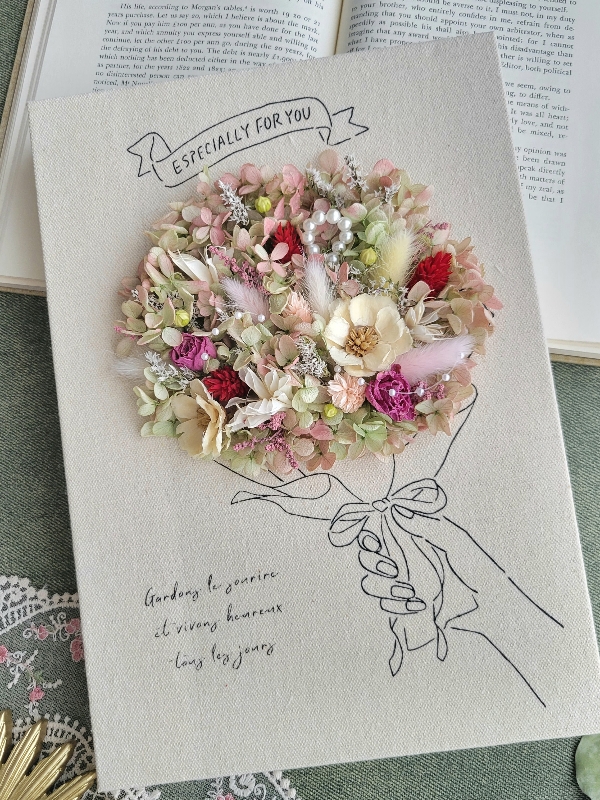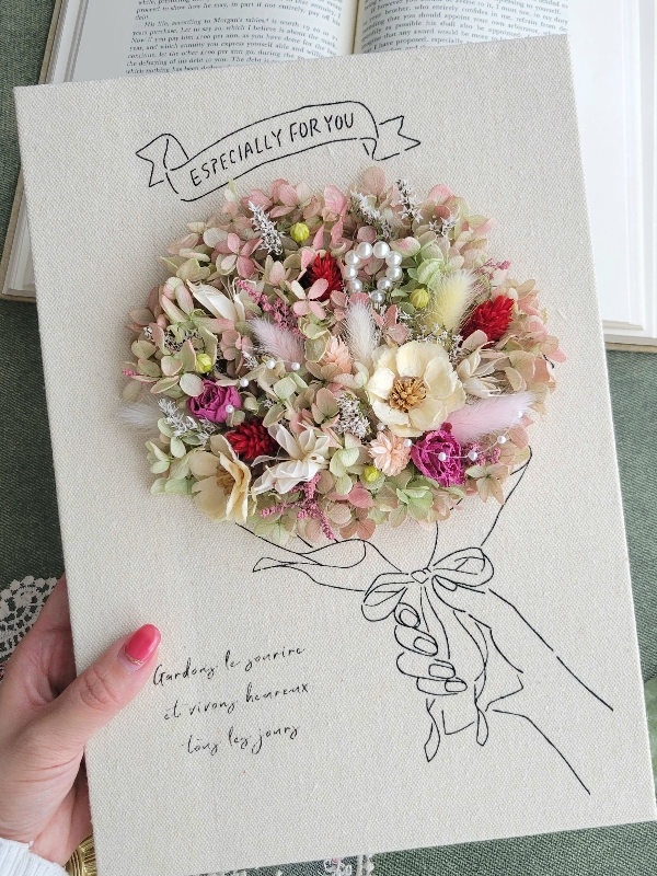 シンプルなキャンバスボードに華やかなお花を飾り付けました。