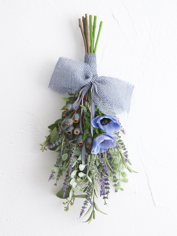 アーティフィシャルフラワー(造花)のブルーのアネモネとラベンダー、ユーカリなどスモーキーなグリーンハーブを束ねたナチュラルなスワッグです。