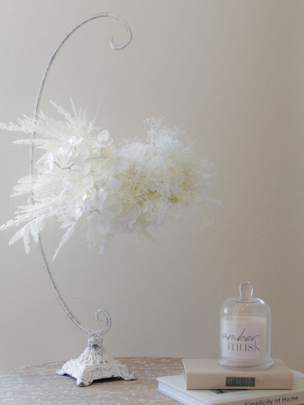 あじさいで柔らかな曲線のボリュームを作り、パンパスやカスミソウでふんわりとした空気感を作ります。