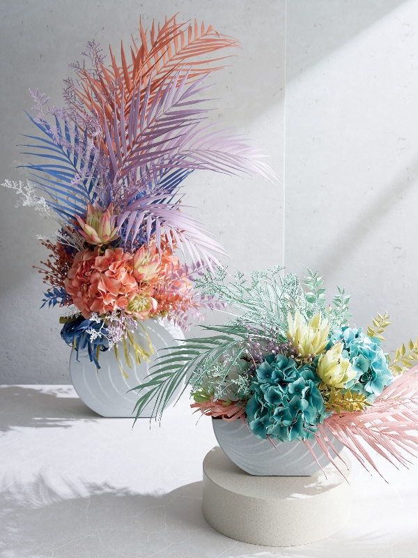 オレンジをメインにパステルトーンで合わせたポップなアレンジメント。ベースの波打つラインに合わせてサイカスでライン作り。首元はハイドランジアでキュッとポイントを作ります。ペーパーラフィアをあしらい完成。