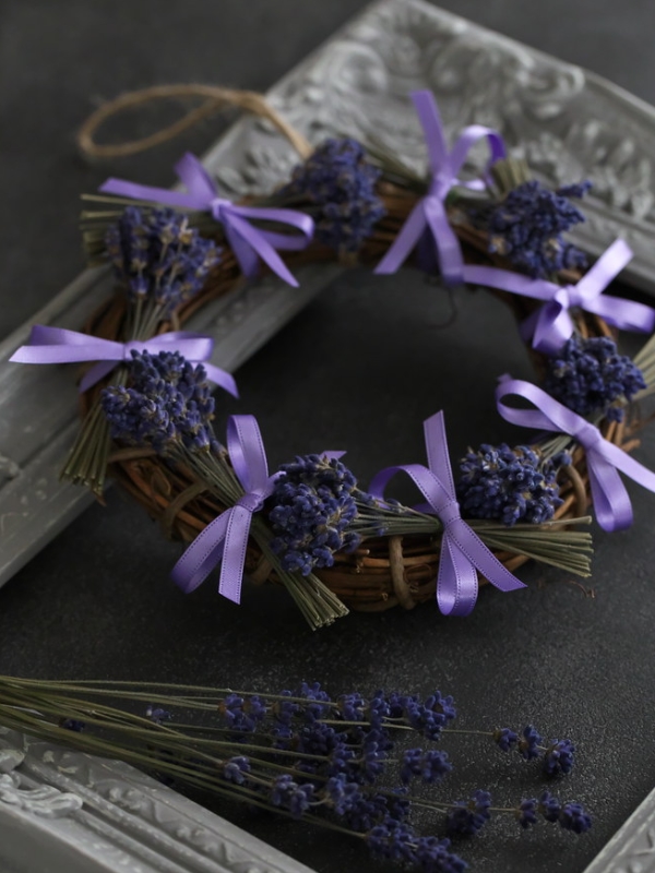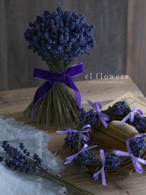 ドライラベンダーを約250本使用し、スパイラル状にきゅっと束ねた自立するスタンドブーケと、小さなブーケを作り丸く配置したリースです。