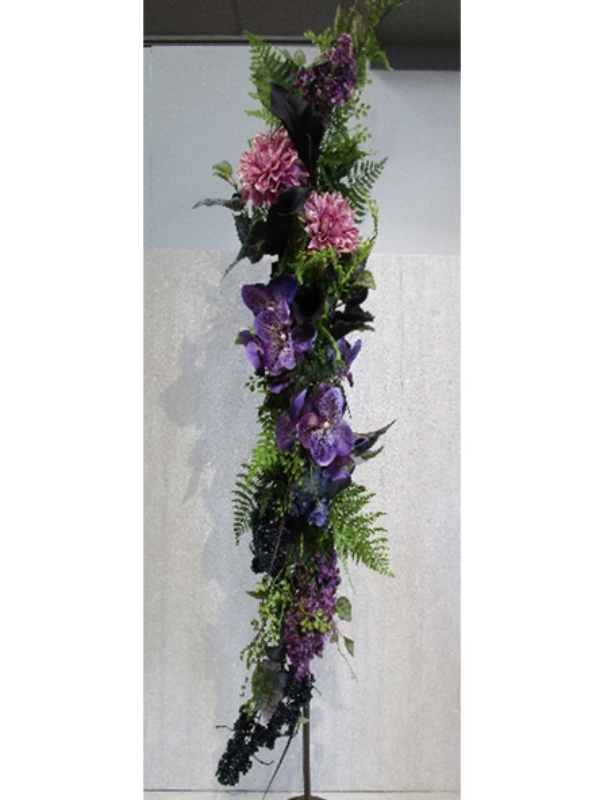 このSライン・スワッグは、エレガントで洗練されたデザインを特徴とし、美しいS字のラインを持つアレンジメントです。華やかなパープルの胡蝶蘭やダリアが主役となり、グリーンが優雅なカーブを描きながら流れるように配置されています。
