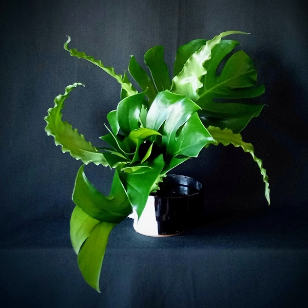 ヒラヒラが可愛らしいタニワタリと南国ムード漂うモンステラをダイナミックにいけました。植物の緑は私たちに癒やしや安らぎ、涼やかさを与えてくれますね。葉の美しい緑だけに着目してみると、意外な発見や心の移り変わりを感じられるかもしれませんよ!