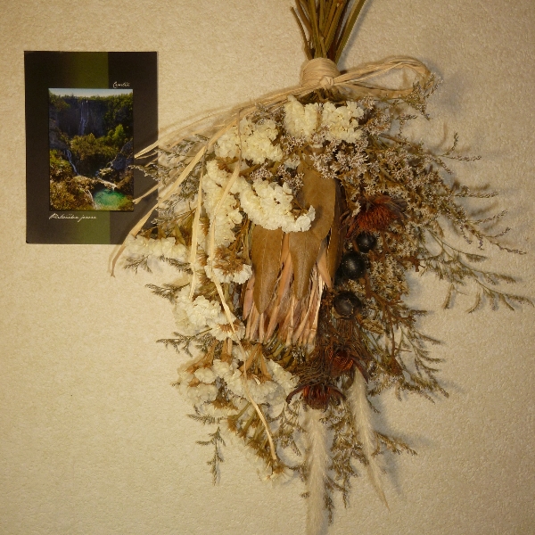 プロテアをメインにしたスワッグ。敢えてスターチスを片側だけに配置しました。