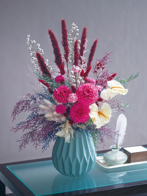 ダリアやアンスリュームを贅沢に使った、周年記念などのお祝いに贈れるギフト・装飾アレンジ
