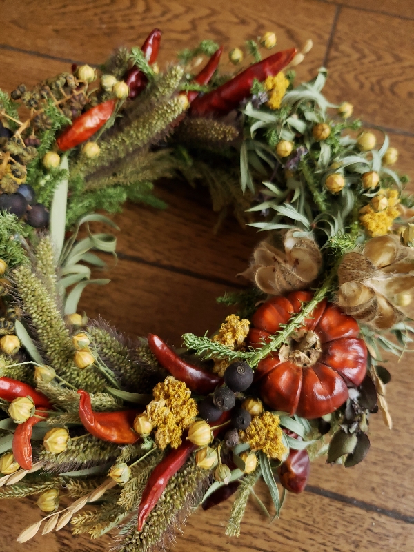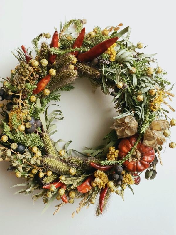 実ものや穂もの、たっぷりとしたグリーンでまとめたドライリース。