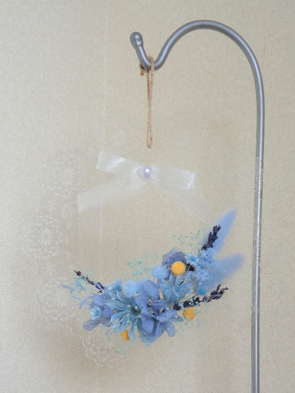 背景が白いため見づらいですが、涼しさを少しでも感じることができるよう透明のアクリルレースプレートと寒色の花材を使い、アクセントとして黄色のボタンフラワーを少しだけ入れました。