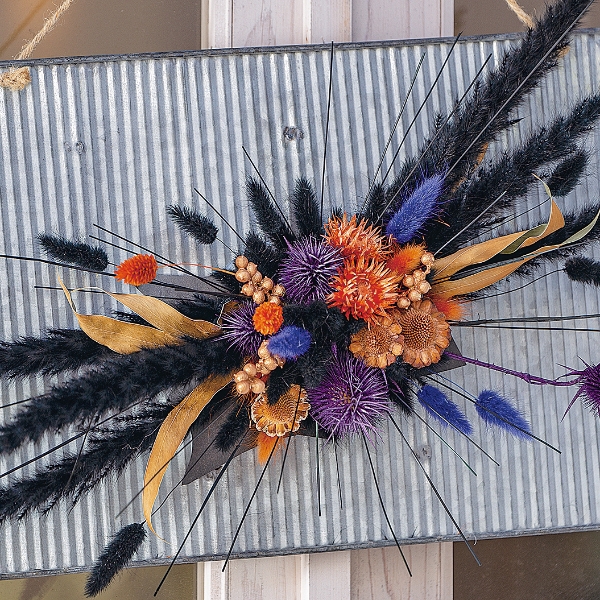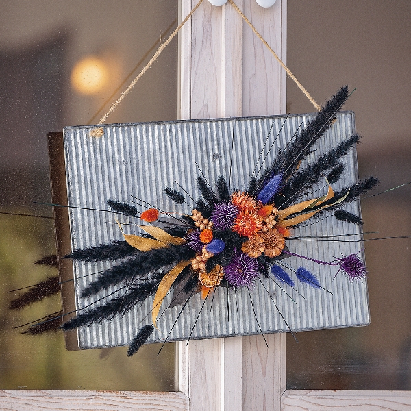 オレンジとブラックのハロウィンカラーを使った壁掛けアレンジ。